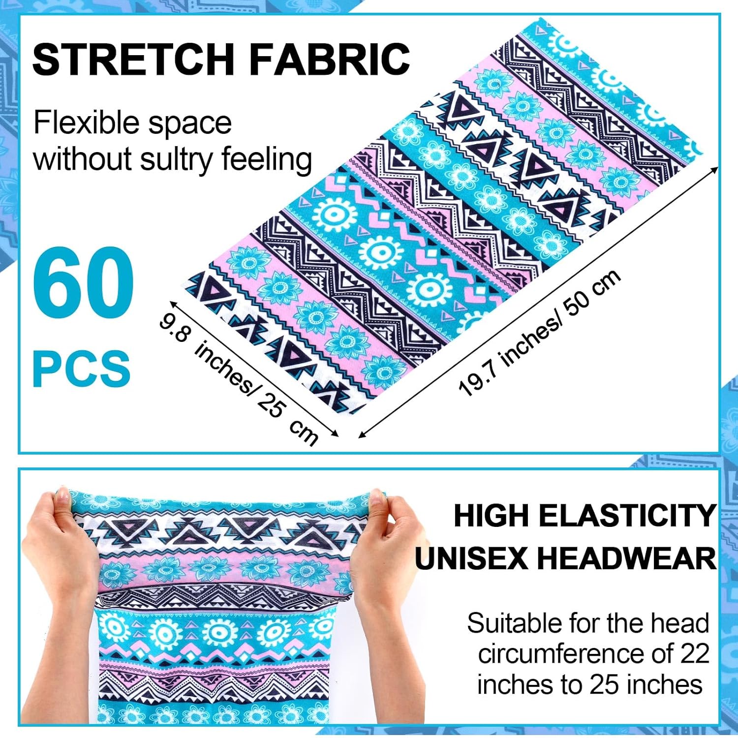 - One Size Fits Most: our headwear bandana face mask comes in one size design, measuring about 9.8 x 19.7 inches/ 25 x 50 cm (1-2 cm error is allowed), which is suitable for the head circumference of 22 inches to 25 inches, with elasticity, not too tight or too loose; Please check the size before purchasing