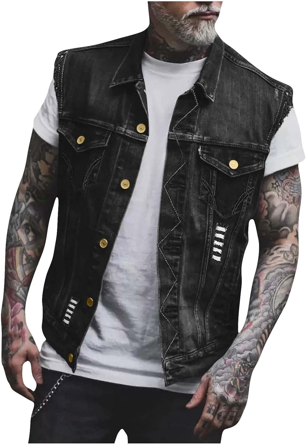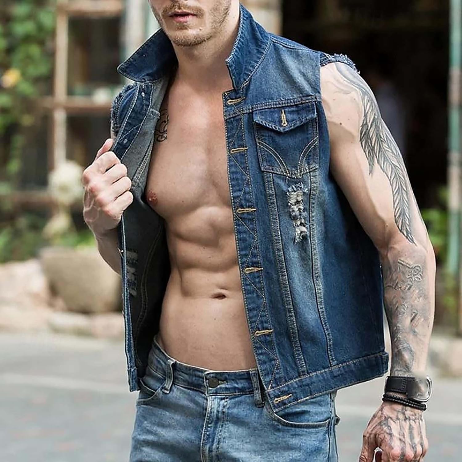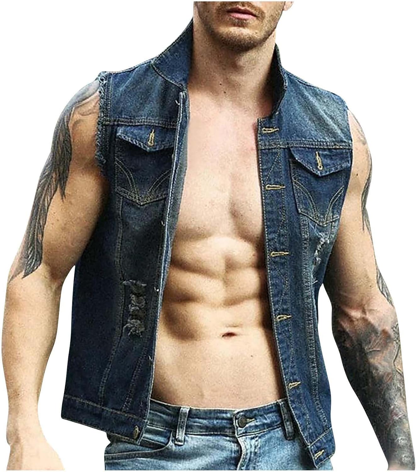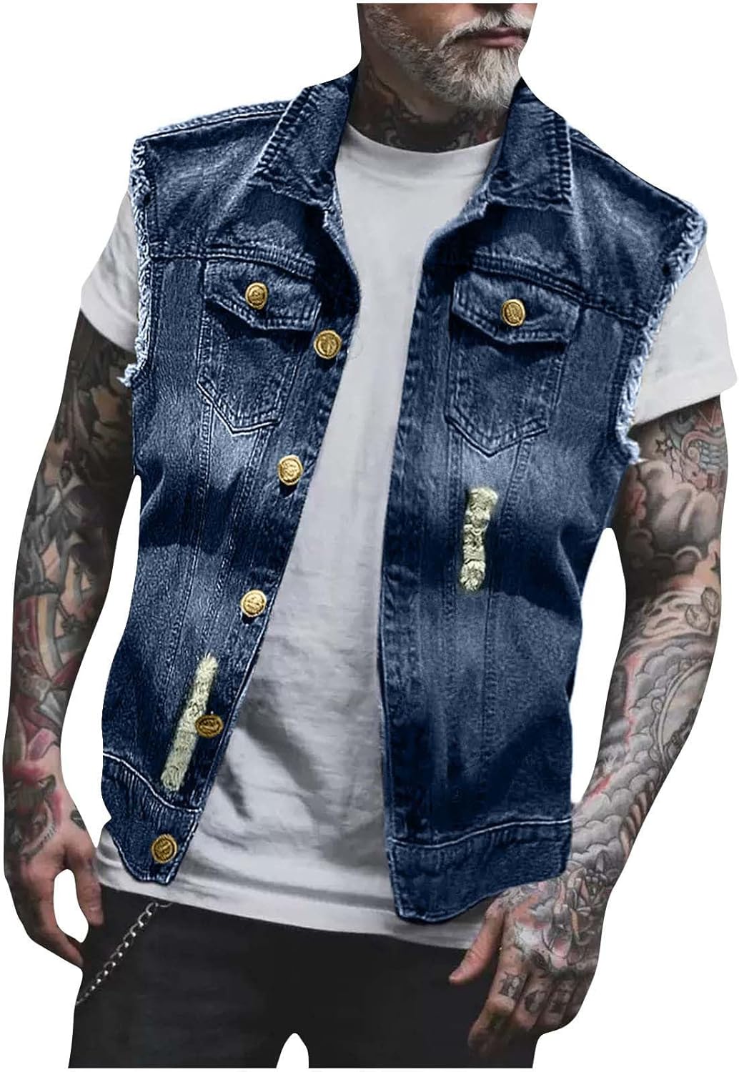 Akklian Men’s 2025 Retro Ripped Denim Vest Sleeveless Button Down Jean Jacket Slim Fit Vintage Casual Lapel Summer Jackets