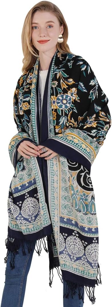 - VERSATILE BREATHABLE WOMAN WRAPS AND SHAWLS: As its oversized, the pashmina is more than one shawl, it can be flexibly used as cape, poncho, dupatta, blanket, wraps, bathrobe, neckwear, cardigan. With the exotic and delicate designs, a perfect pashmina wrap for every women.